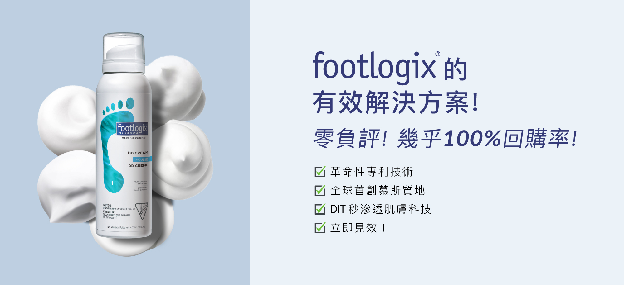 有別於其他足部護理產品的冰冷油膩不易吸收,Footlogix的超細緻慕斯質地將帶給您前所未有的舒適感,輕鬆吸收,立即有感!