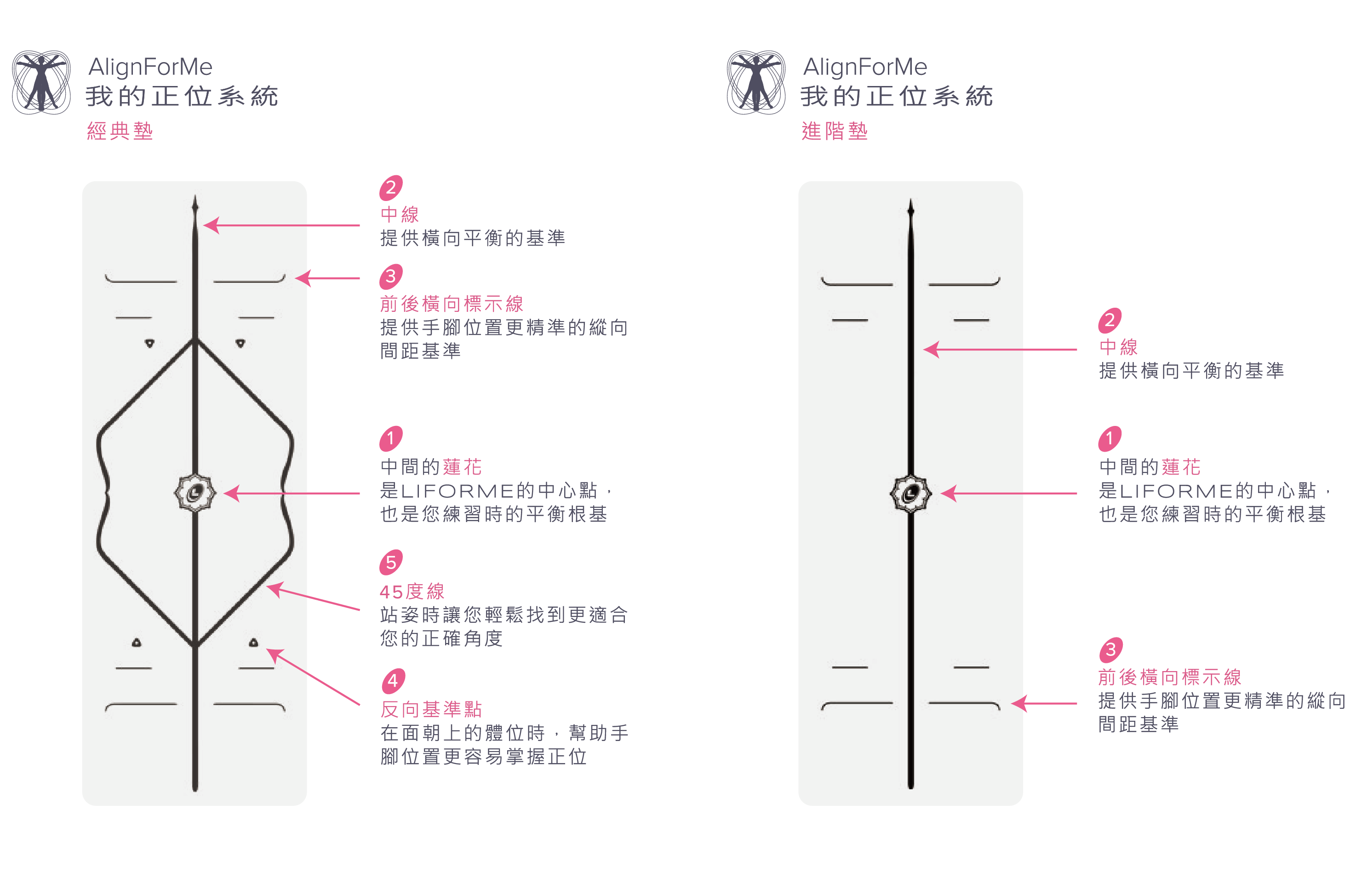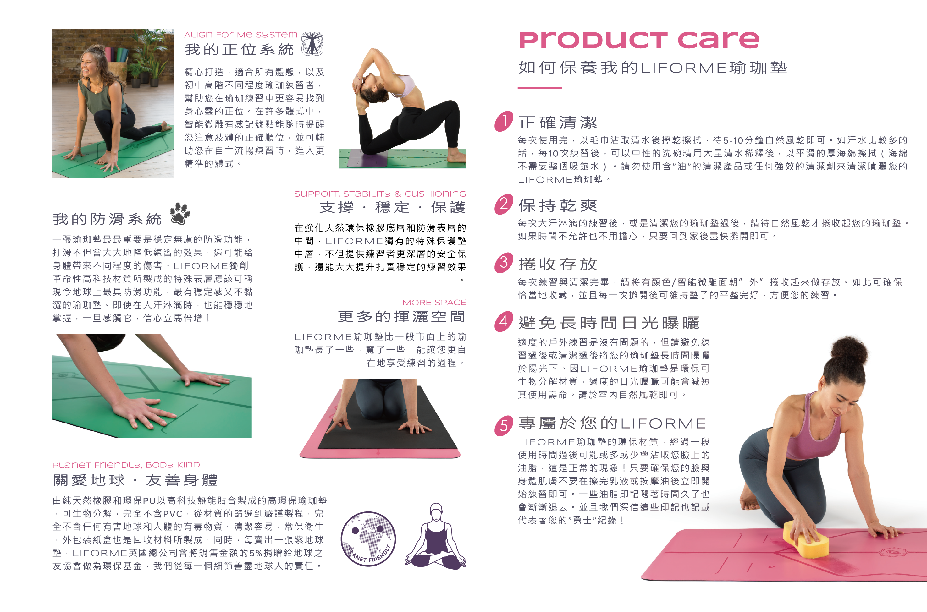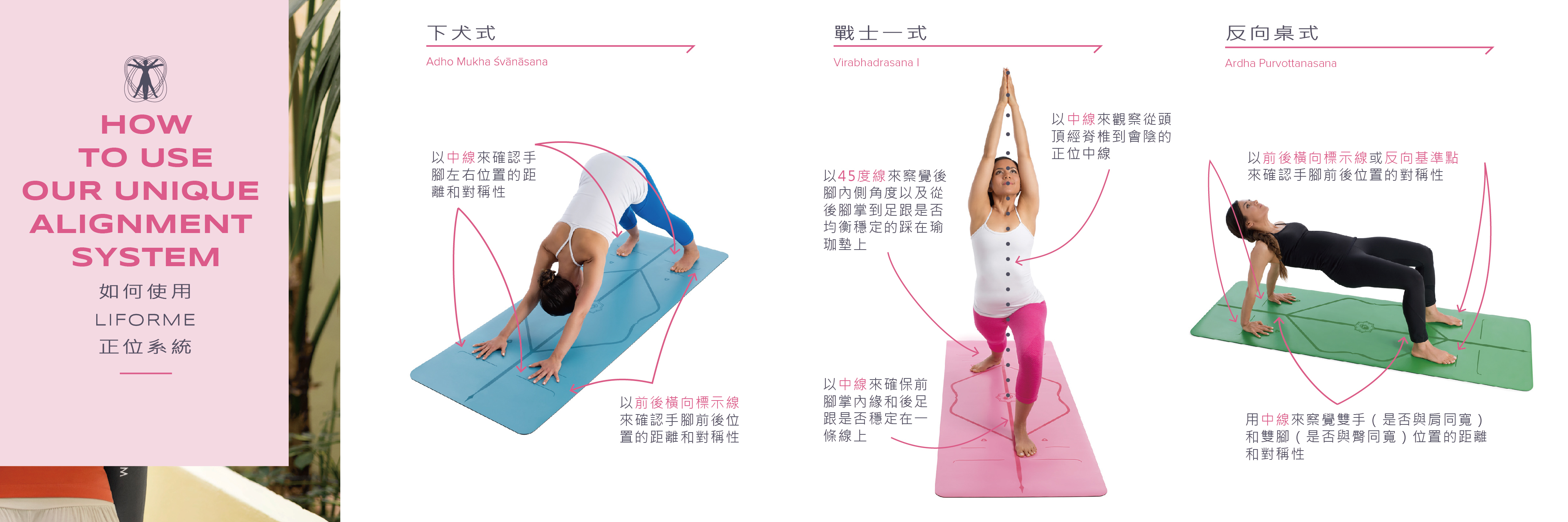 比起市面上的瑜珈墊,LIFORME長一些,寬一些的空間,能讓練習更自在寫意,墊子的功能不但更強化扎實而深層,更具備無可超越的穩定性,加上獨有 “我的正位系統 Align For Me System” 能幫助練習者更容易找到肢體的順位, 這是大多數使用者公認此生用過最棒的瑜珈墊!