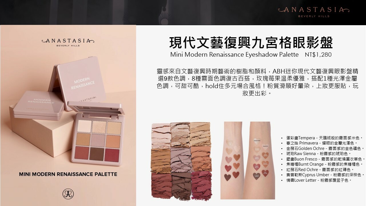 靈感來自文藝復興時期藝術的樹脂和顏料,ABH迷你現代文藝復興眼影盤精選9款色調,8種霧面色調復古百搭,玫瑰莓果溫柔優雅,搭配1種光澤金屬色調,可甜可酷,hold住多元場合風格!粉質滑順好暈染,上妝更服貼,玩妝更出彩。