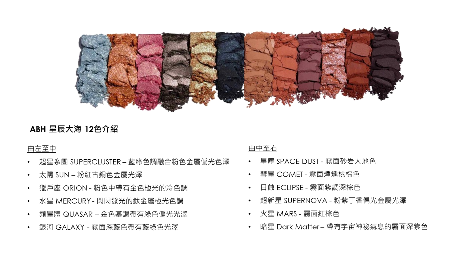 包含5款霧面質地與7款金屬光澤眼影,如同不同星系之間交織閃爍,12種宇宙色彩帶您遨遊星際。