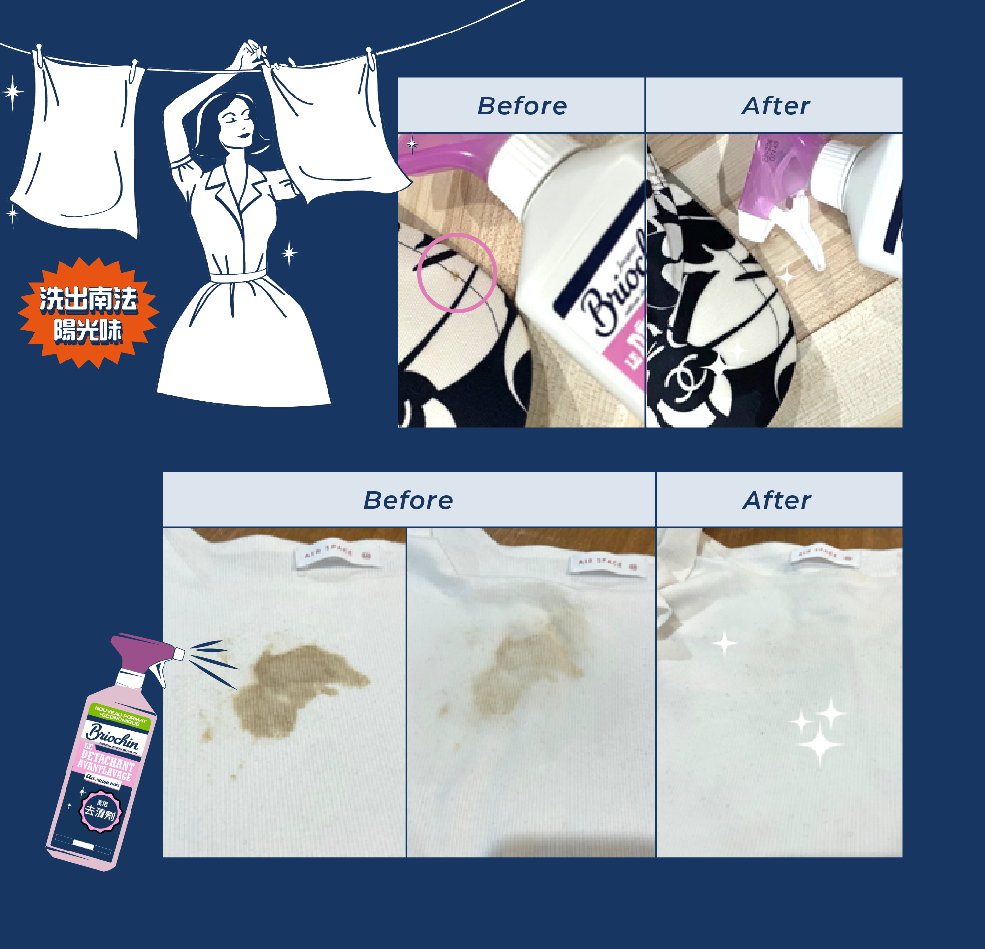 •血漬、酒漬、醬料等髒污一噴輕搓即掉,散發怡人花香,適用於任何織品材質。