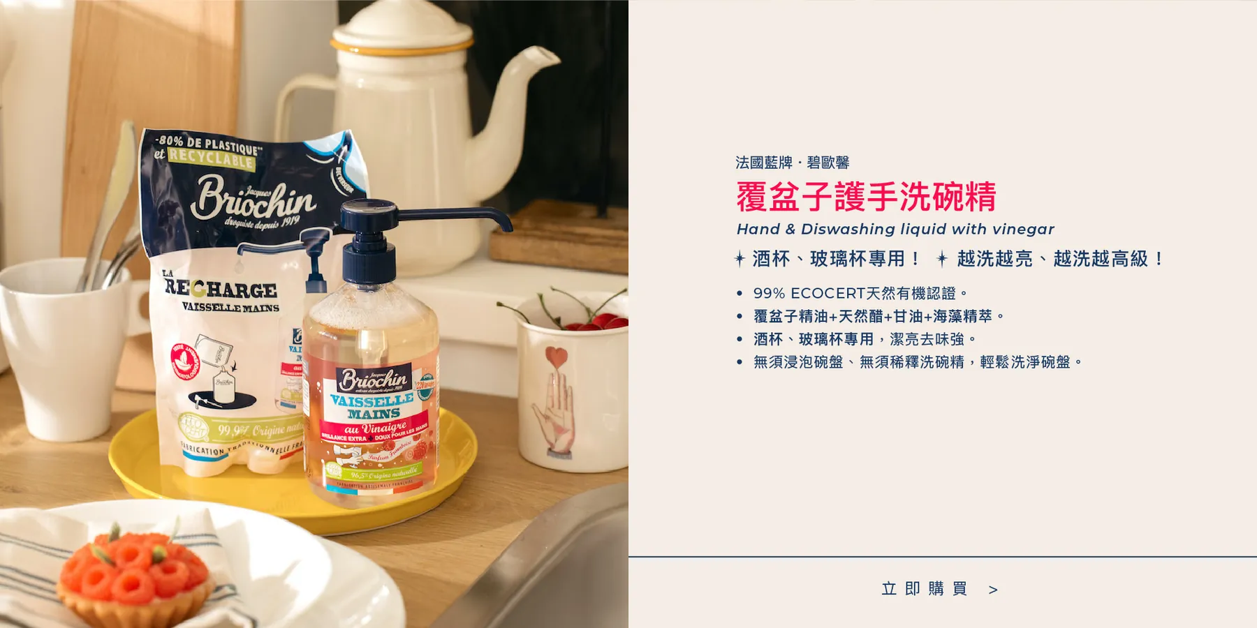 👉 覆盆子洗碗精:含天然清潔醋、覆盆莓精油、海藻成分,具潔亮去味功效 ,適用於酒杯、水杯、玻璃杯等,越洗越亮、越洗越高級。