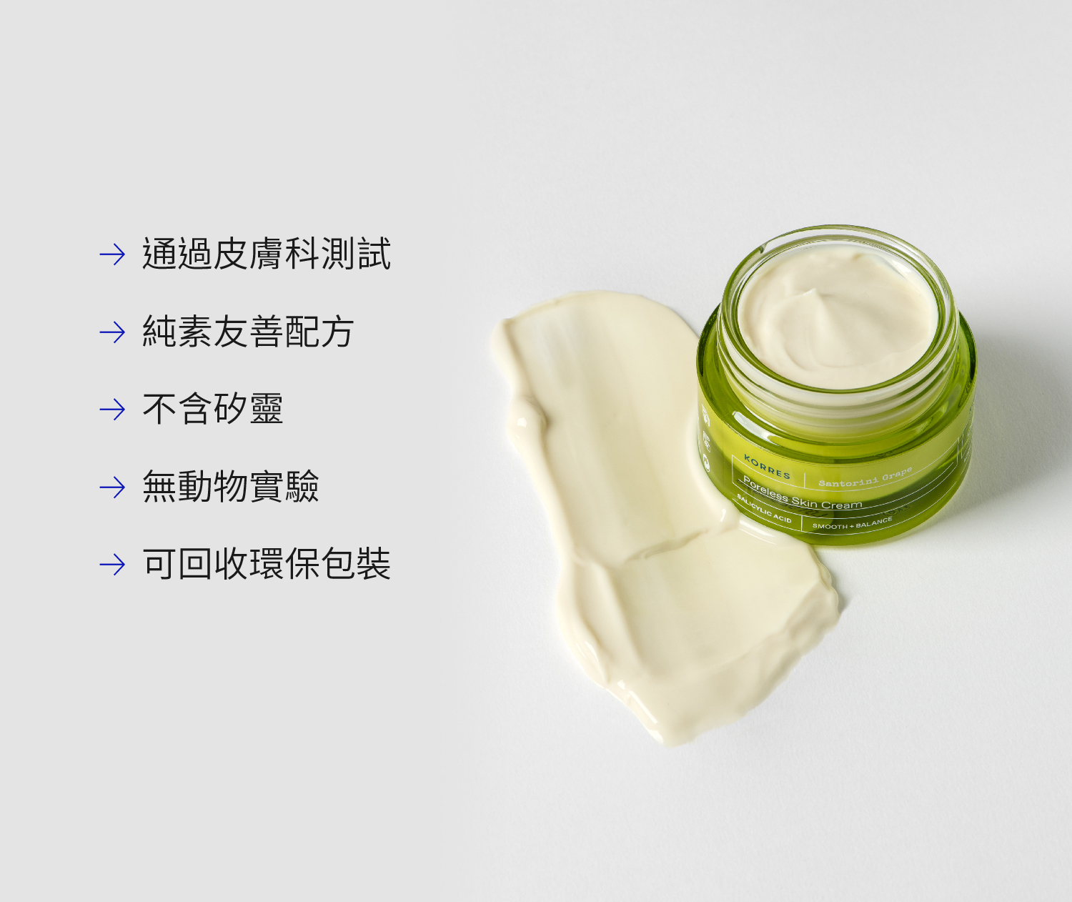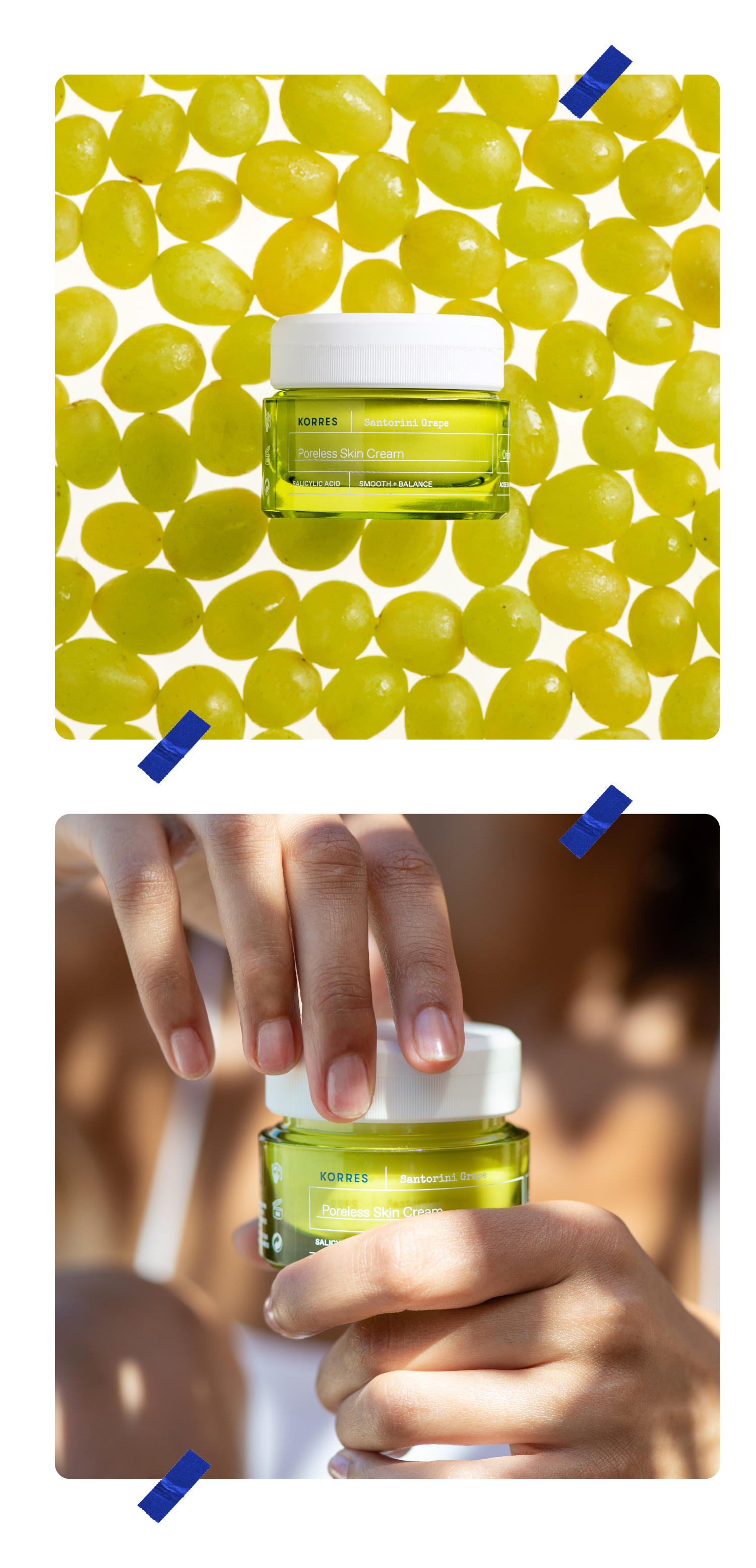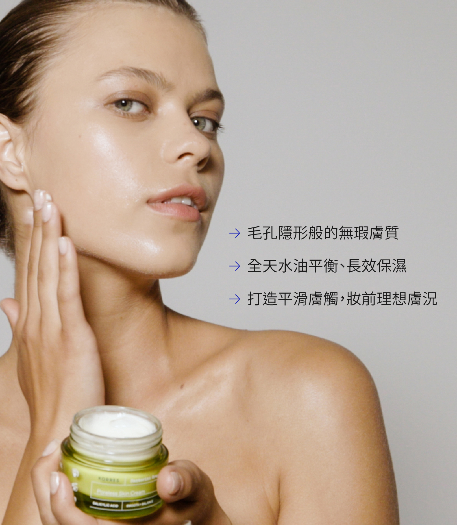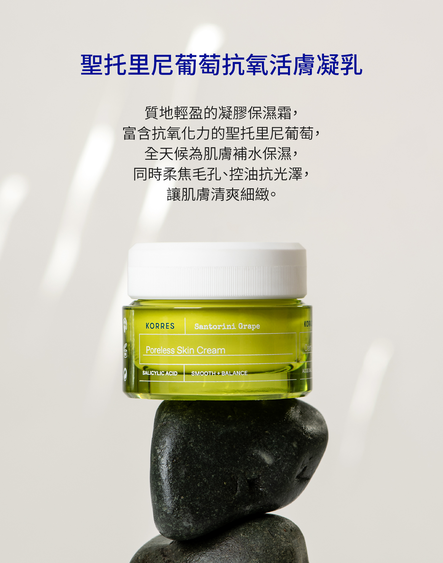 質地輕盈的凝膠保濕霜,富含抗氧化力的聖托里尼葡萄,全天候為肌膚補水保濕,同時柔焦毛孔、控油抗光澤,讓肌膚清爽細緻。