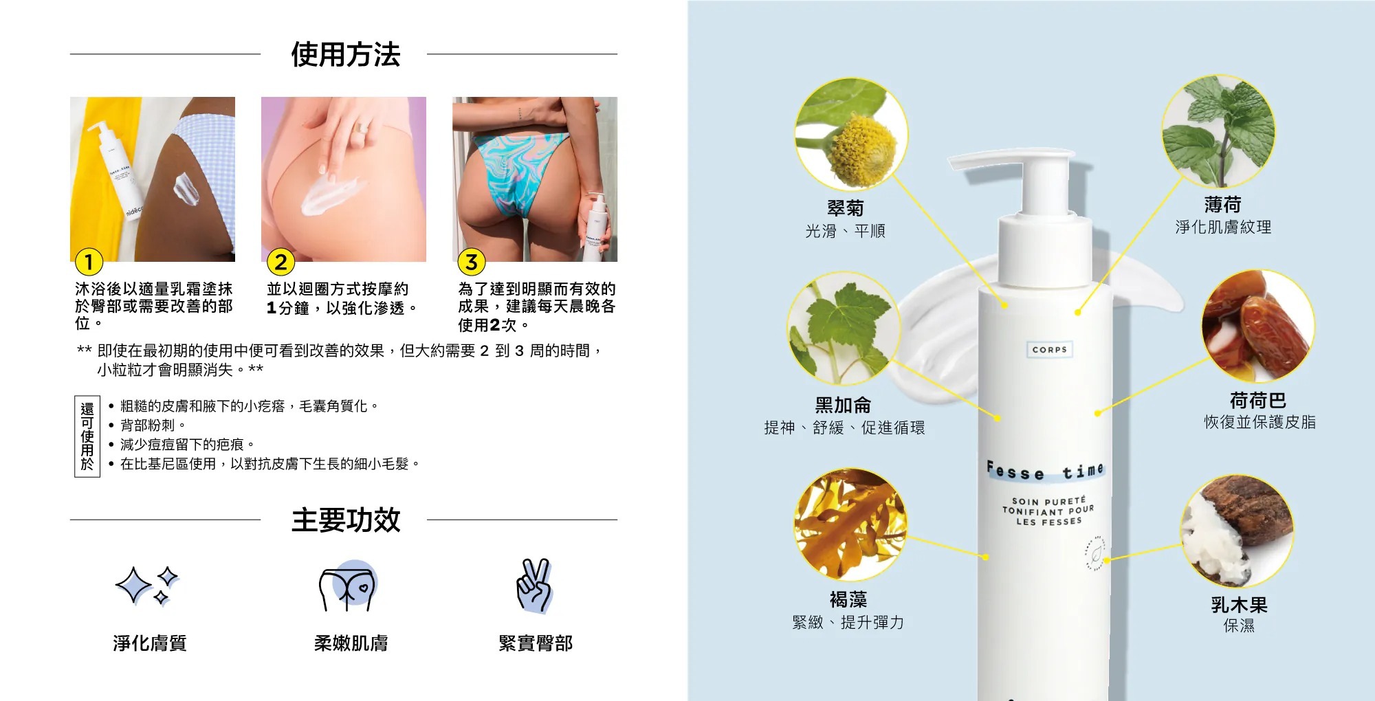 針對臀部和身體其他部位的小痘痘問題有針對性改善作用! 對於其他身體部位的體痘(胸前、背部、手臂等)也非常有效。