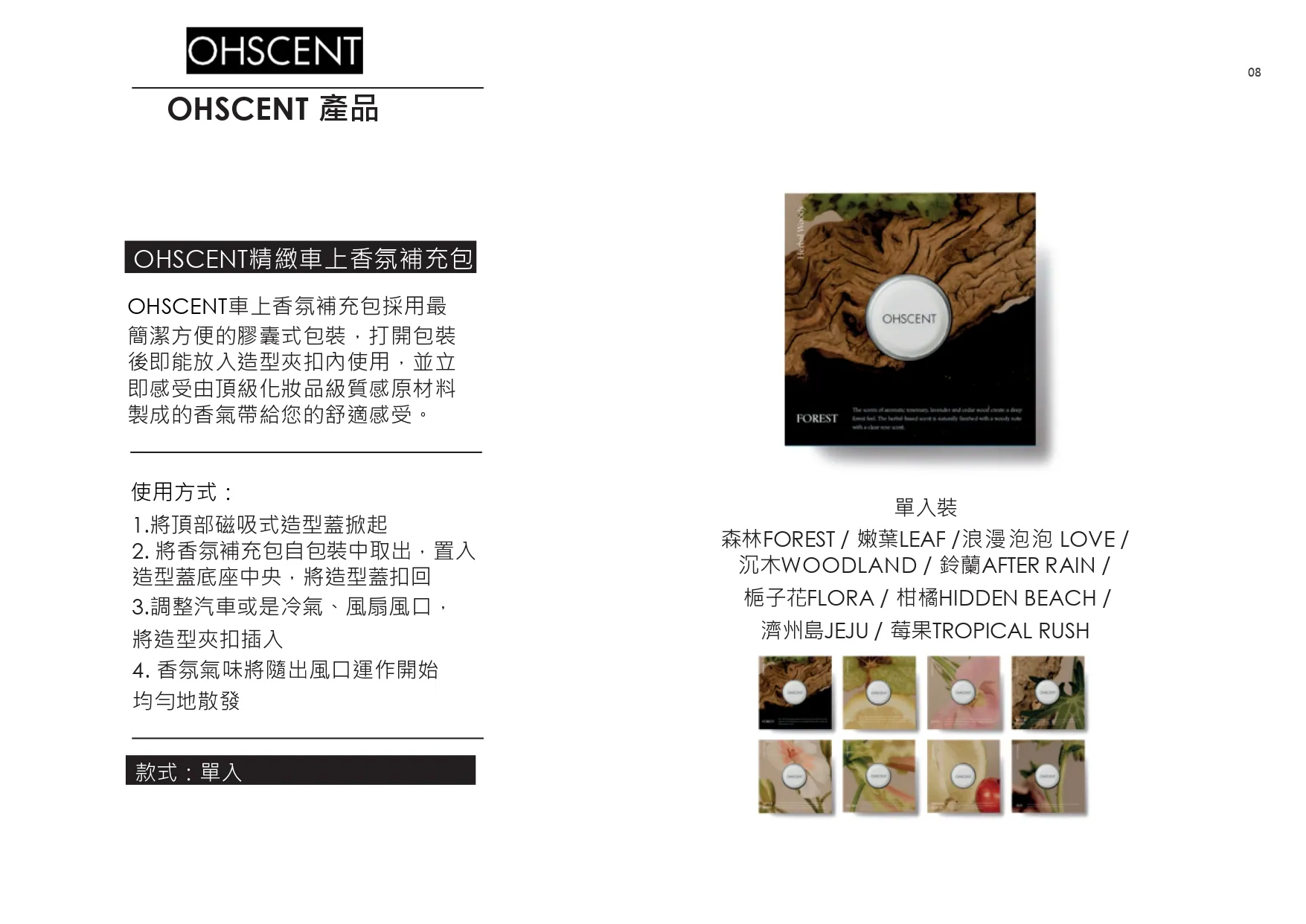 OHSCENT車上香氛補充包採用最簡潔方便的膠囊式包裝,打開包裝後即能放入造型夾扣內使用,並立即感受由頂級化妝品級質感原材料製成的香氣帶給您的舒適感受。