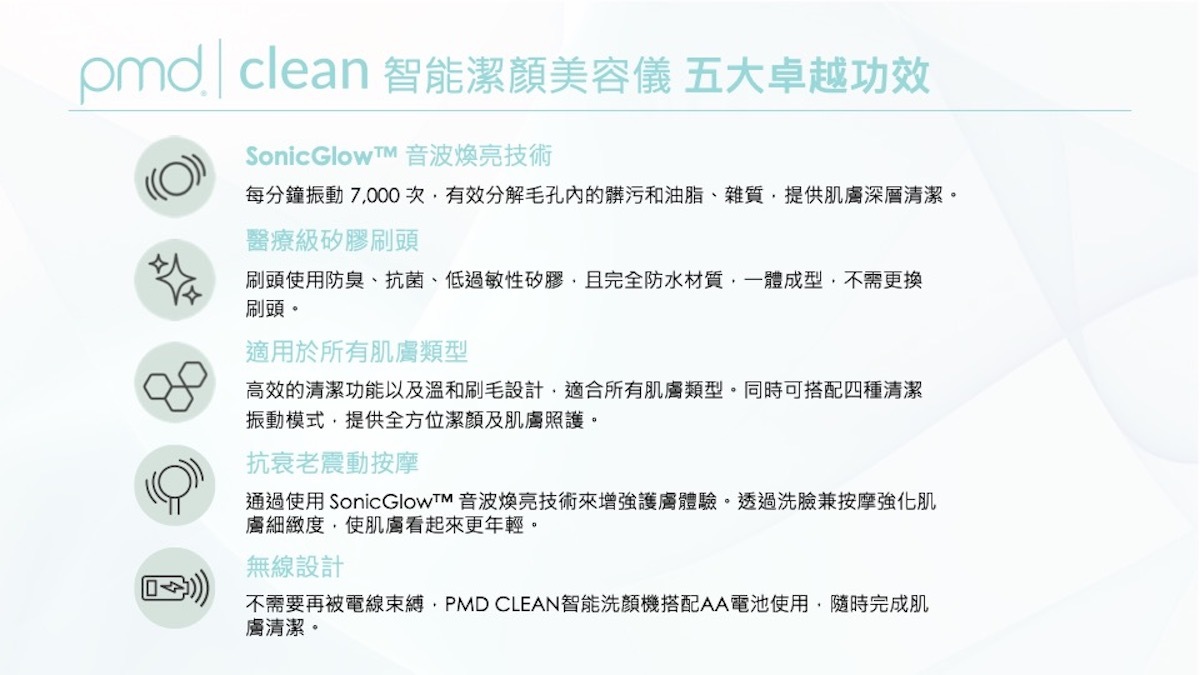 擁有每分鐘震動7,000次音波煥亮技術,有效分解髒污、油脂,幫肌膚做深層洗淨!